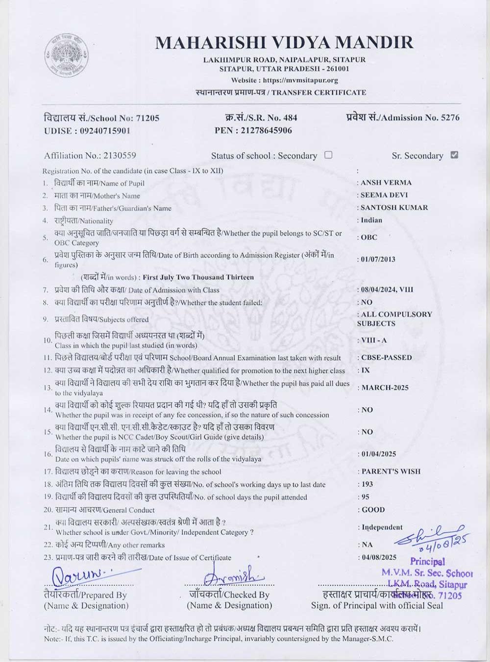 | 9 | 5276 | ANSH VERMA | IX | A | |