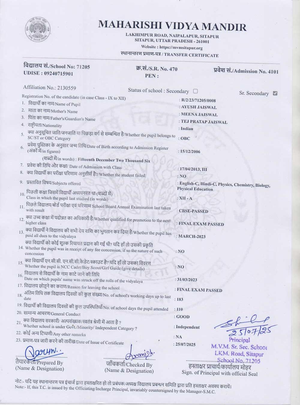 | 22 | 4101 | AYUSH JAISWAL | XII | B | |