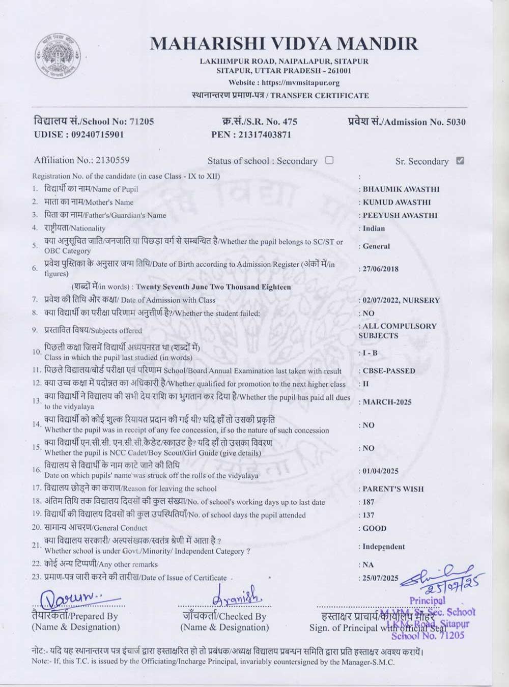 | 17 | 5030 | BHAUMIK AWASTHI | II | B | |