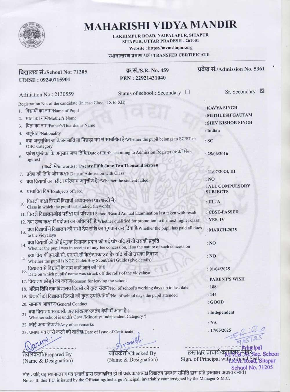 | 33 | 5361 | KAVYA SINGH | IV | A | |