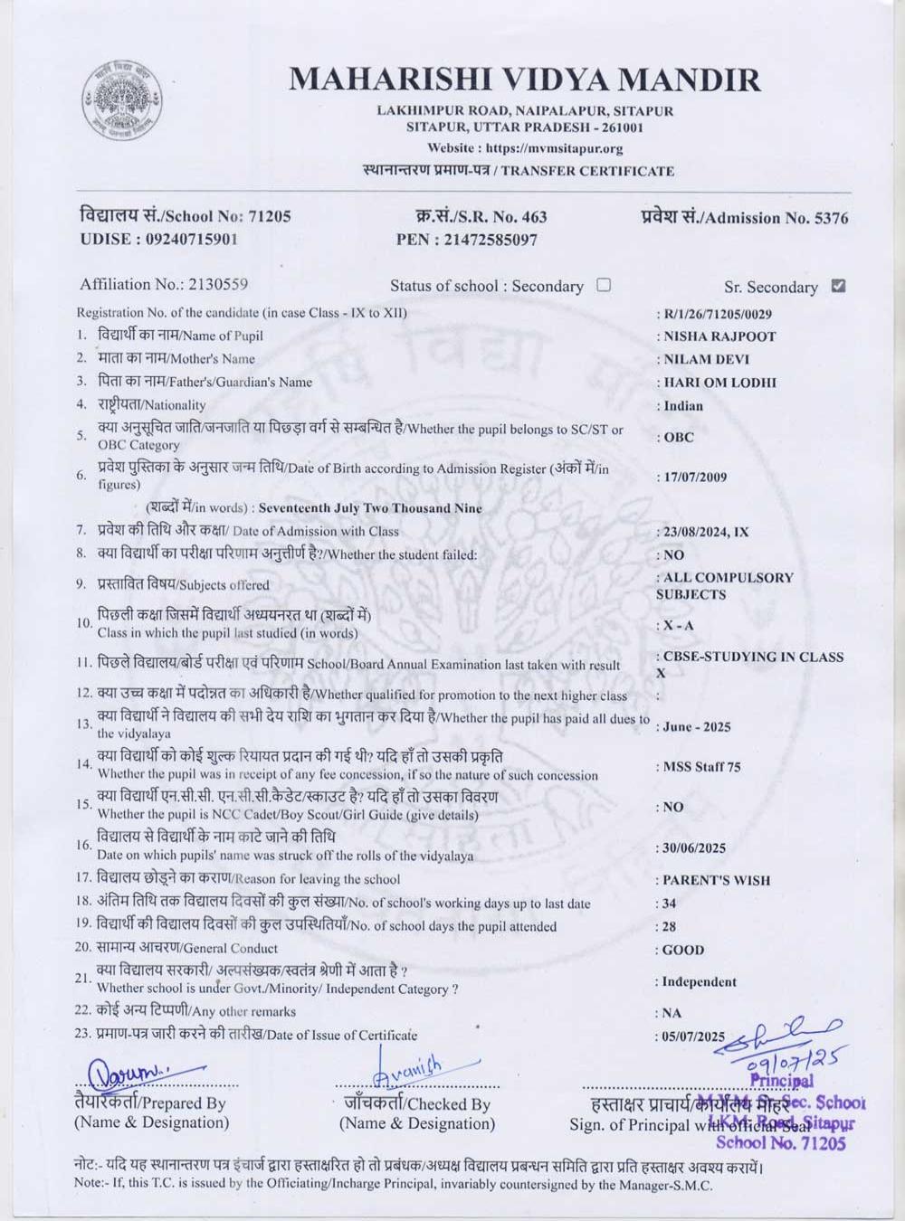 | 29 | 5376 | NISHA RAJPOOT | X | A | |