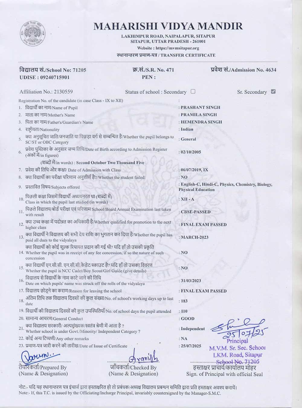 | 21 | 4634 | PRASHANT SINGH | XII | B | |