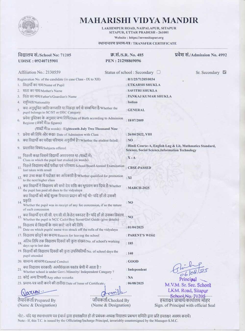 | 8 | 4992 | UTKARSH SHUKLA | XI | A | |
